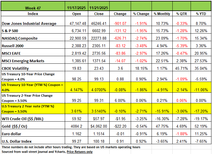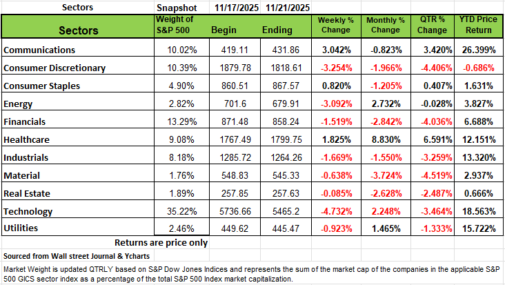 On the upside, the Communications sector was up +3.04% followed by Healthcare sector +1.8% and consumer staples 0.82% The rest of the sectors all posted negative returns on the week. Technology led the sectors decline this week, falling -4.7%, followed by a -3.3% slide in consumer discretionary and a -3.1% drop in energy. Industrials, financials, utilities, materials and real estate also fell. Advanced Micro Devices (AMD) shares fell 17%, and Micron Technology (MU) dropped 16%. Nvidia shed 5.9% despite stronger-than-expected fiscal Q3 results.
