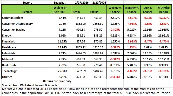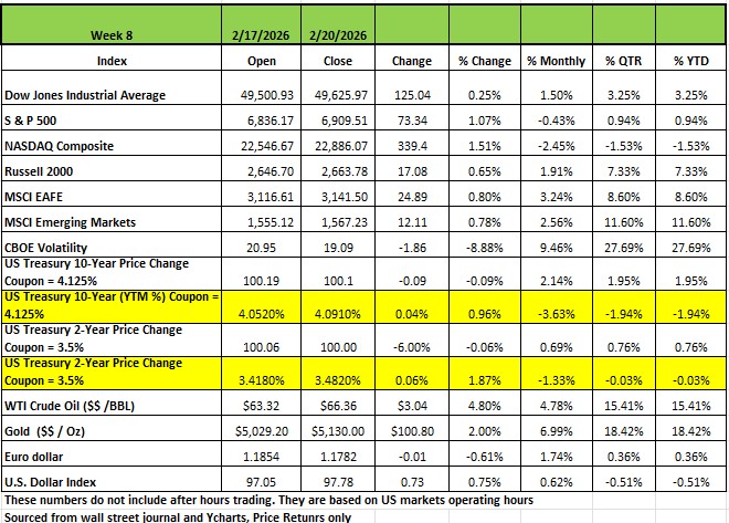 All four of the major indices finished the shorten trading week in positive territory for the week ending Feb 20th 2026, with the NASDAQ posting the largest increase of +1.51% on the week. The S&P 500 index rose +1.1% led by communication services, as investors digested changes to US tariff policy amid a Supreme Court ruling. The Russell 2000 finished up +0.65% and the DOW +0.25%. The S&P and the NASDAQ are both still down for the month of February