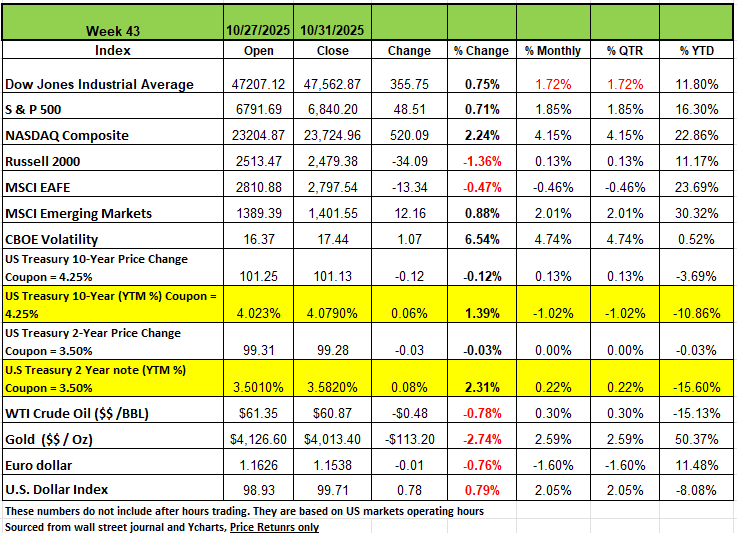 The first month in Q4 is now behind us leaving another 61 days (38 trading days) before the close of 2025. Last week only one of the four major indices posted a decline the Russell 2000 ended the last week of October -1.36% and only up 0.13% on the month. The NASDAQ posted the largest gain last week, +2.24% and + 4.15% on the month this was followed by the DOW and S&P 500 both up +0.75% and 0.71%, respectively, +1.72% and 1.85% on the month of October. The U.S. President met with Chinese President on Thursday to finalize a one-year trade agreement between the world's largest economies that is expected to be routinely extended. China agreed to resume purchases of US soybeans, keep rare-earth exports flowing and crack down on the illicit trade of fentanyl. The US, meanwhile, will halve the tariff rate on the Asian nation related to fentanyl, cutting the overall levy to about 47%.