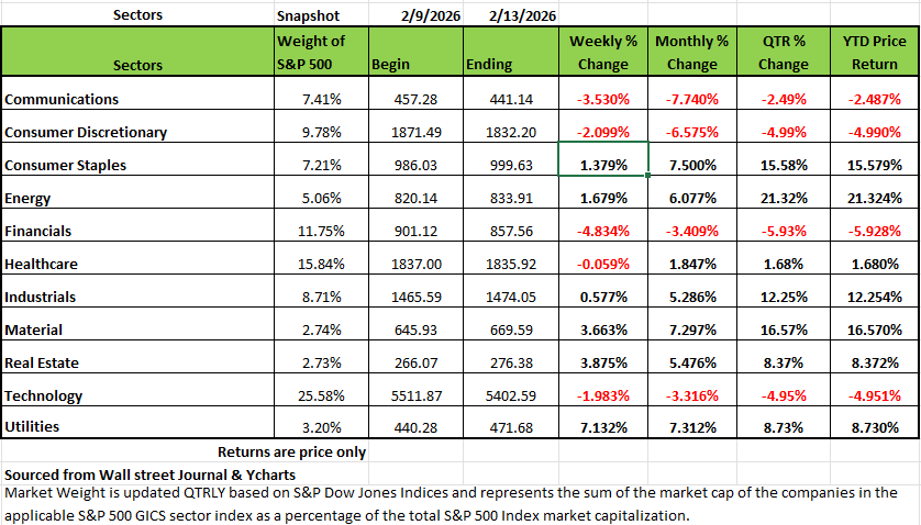 All Four of the major indices were down on the week ending Feb 13th 2026 with the NASDAQ posting the largest decline with a -2.1% this brings the index down -2.99% on the year so far. This was followed by the S&P 500 with a -1.48% decline and the DOW -1.23%. The Russell 2000 had a -0.89% decline