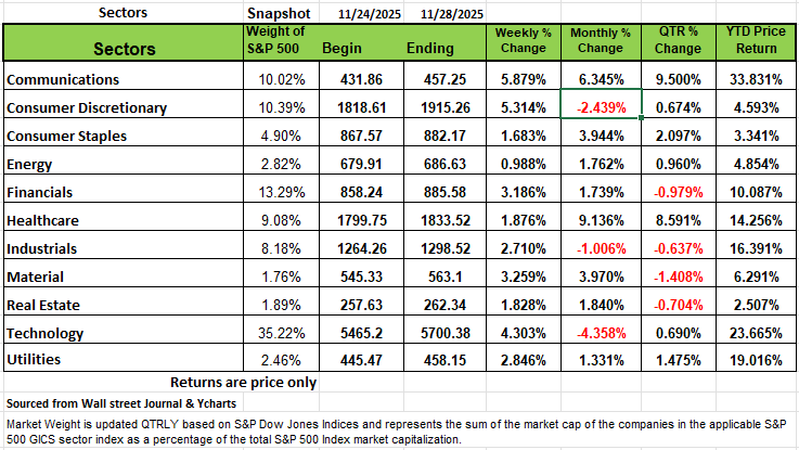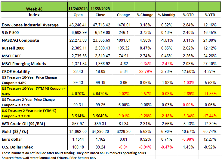 All of the major indices posted positive returns on an abbreviated week due to the Thanksgiving Holiday last week. The Russell 2000 had the highest returns with a +8.47% return followed by the NASDAQ +4.9%. The S&P 500 returned 3.7% and the DOW +3.18%. Last week's performance brought 3 of the 4 indices into the black for the month of November with only the NASDAQ posting a decline of -1.5% on the month. November is the 2nd most volatile month in 2025, only April was more volatile with Liberation Day and the President’s pivot on tariffs after markets declined dramatically on April 7th. Last week marked a significant turnaround in a short time -- just a week earlier, the S&P 500 had been down -3.5% for the month. The index is now up +16% this year.