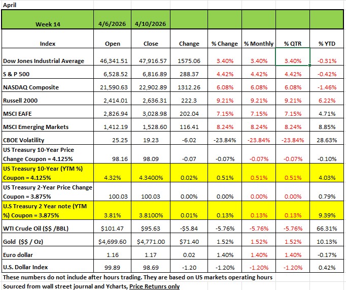 To say that the markets are volatile would be an understatement. At the end of Q1 (march 31st) all the major indices were down. The DOW and S&P 500 were down more than -5% on a YTD basis. This after both indices hitting all-time highs in February. As of Friday, all indices are almost at breakeven for the year just down a few basis points YTD The Rissell 2000 had the largest gain last week gaining +9.21% followed by the NASDAQ at +6.08% the S&P500 +4.42% and the DOW up +3.4%. All markets moved mostly on Wednesday ahead of high-stakes peace talks between Iran and the US and a positive outlook on the beginning of Q1 earnings reporting season.