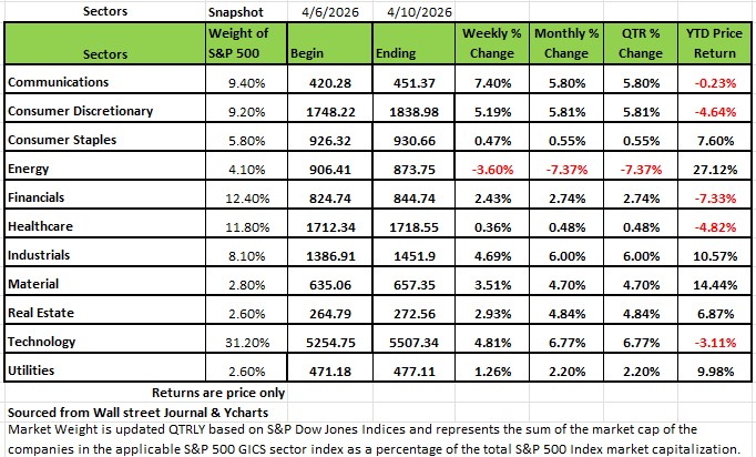 Every sector other than energy rose last week. Communication services +7.4% and Consumer discretionary climbed +5.1% each, followed by a +4.8% gain in technology and a +4.7% advance in industrials. Materials were also strong, up +3.5%, while Real Estate and Financials both rose more than +2% each. Utilities, Consumer Staples and Healthcare also edged higher by less than 1%. Amazon.com (AMZN) was the top performer in consumer discretionary, climbing +13%. The company said its Amazon Web Services' artificial intelligence revenue run rate was more than $15 billion in Q1 and "ascending rapidly." AWS has the potential to grow even faster, Amazon Chief Executive Andy Jassy said in a letter to shareholders. Paramount Skydance (PSKY) had the largest percentage increase in communication services, rising 11.5%. The company's $54 billion bridge loan backing its acquisition of Warner Bros. Discovery (WBD), provided by Bank of America (BAC), Citigroup (C), and Apollo Global Management (APO), has been sold down to wider group of banks and reduced to $49 billion, according a regulatory filing.